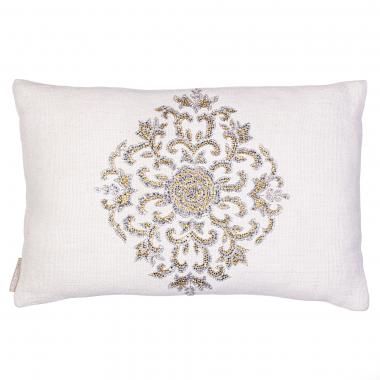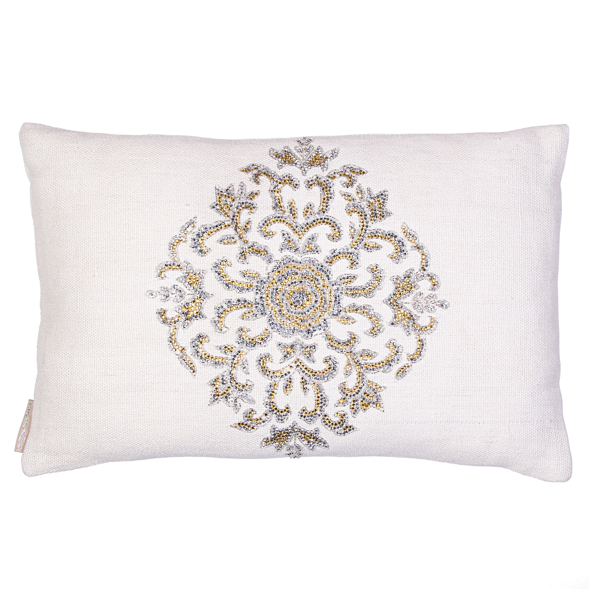 Gold Silver crystal emblem on a basic linen.
