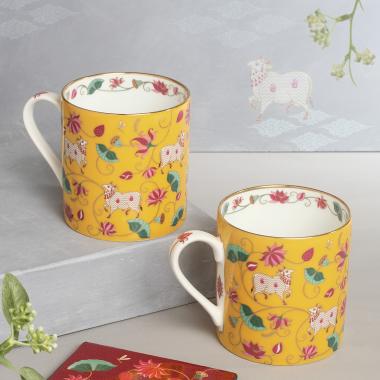 Pichwai cows, intricately detailed with gold chevrons, dance rapturously amidst blossoming lotuses and water lilies. Hand crafted in fine bone china and richly embellished with 24 carat gold accents, each piece is an expression of timeless elegance and joy.