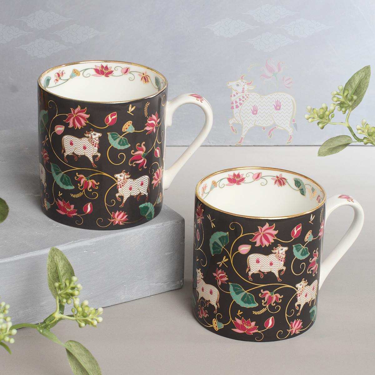 Intricately detailed with gold chevrons, nandi cows dance rapturously amidst blossoming lotuses and water lilies. Hand crafted in fine bone china and richly embellished with 24 carat gold accents, each piece is an expression of timeless elegance and joy.