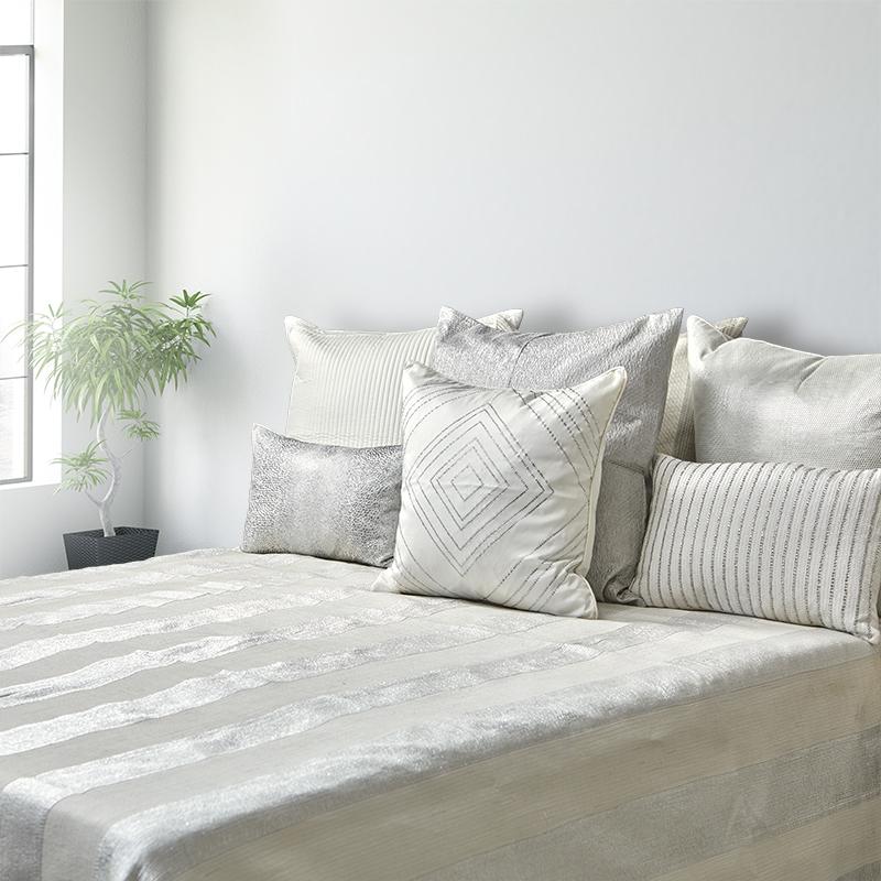 White silk pinstriped with silver threads and vice verse. A stark combination of white and silver silk. Matching shams 2021E