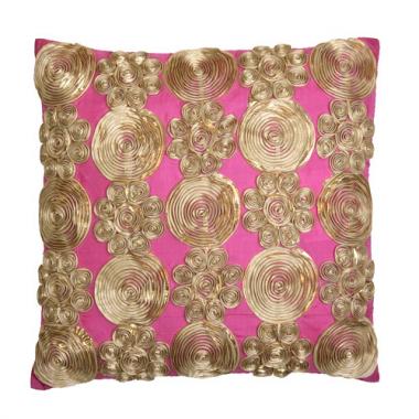 A ooh-la-la pillow in pink or teal color. Dull gold ribbon roses gracefully set on a bright pink silk.