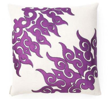 Purple embroidery highlighted with a small sequins on a coarse ivory linen