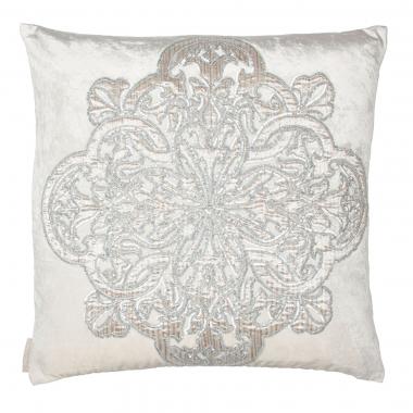 A plush ivory velvet combined with a silk appliqu� of silver haystack - hand-embroidered - not a detail left to chance.