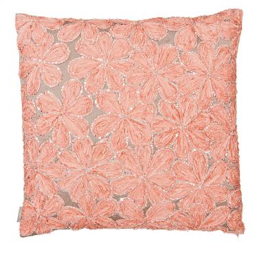 A soothing peach silk cut into strips and hand rolled in to flowers. A slight sequin high lite makes it just the decorative pillow you need