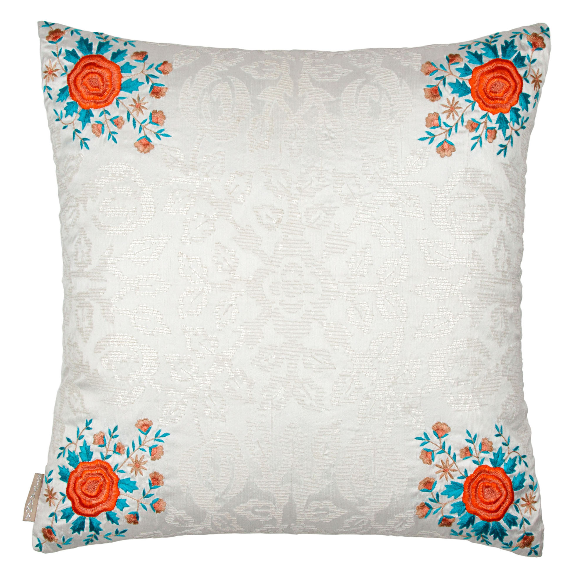 A fresh combination of self-shimmer rose patterned silk and hand-embroidered roses pay homage to the sun in shades of orange and turquoise.