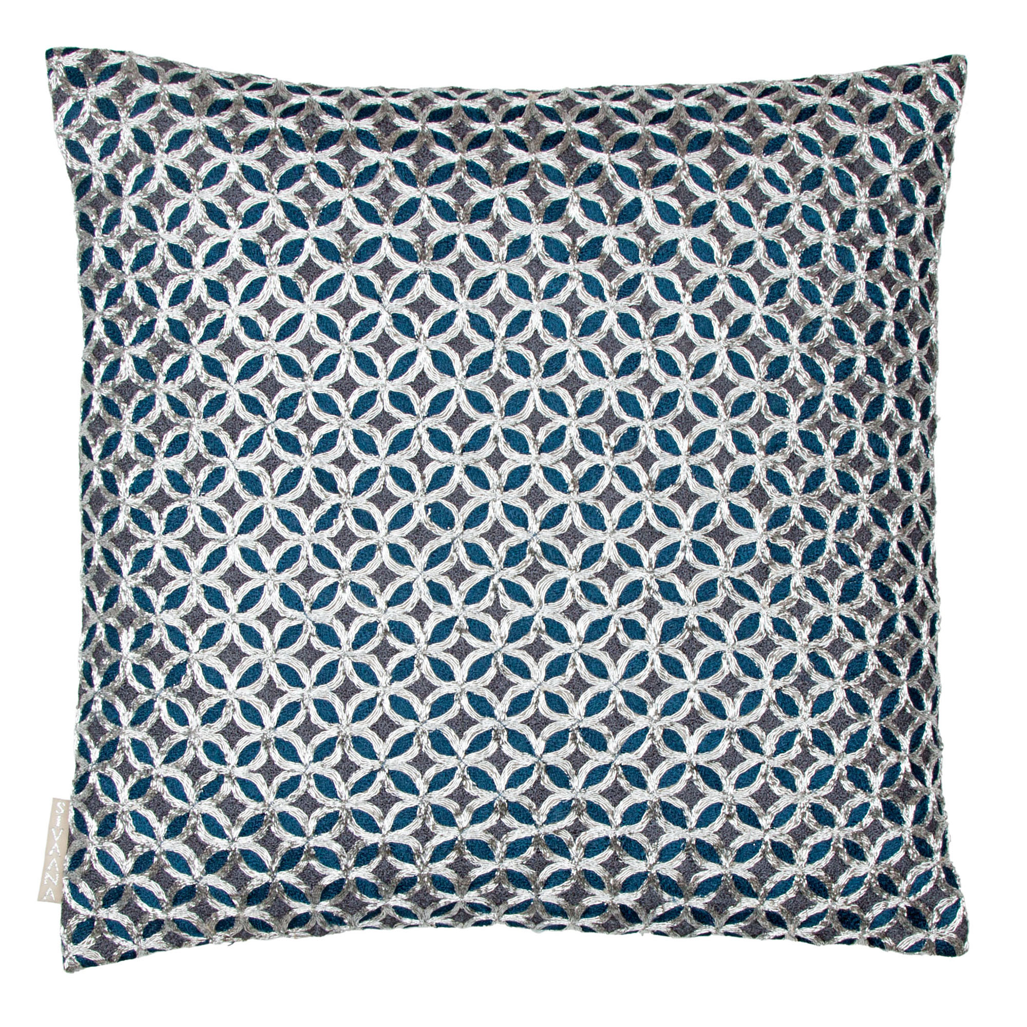 Silver cording defines an overall geometric pattern combining shades of teal and grey for visual depth.