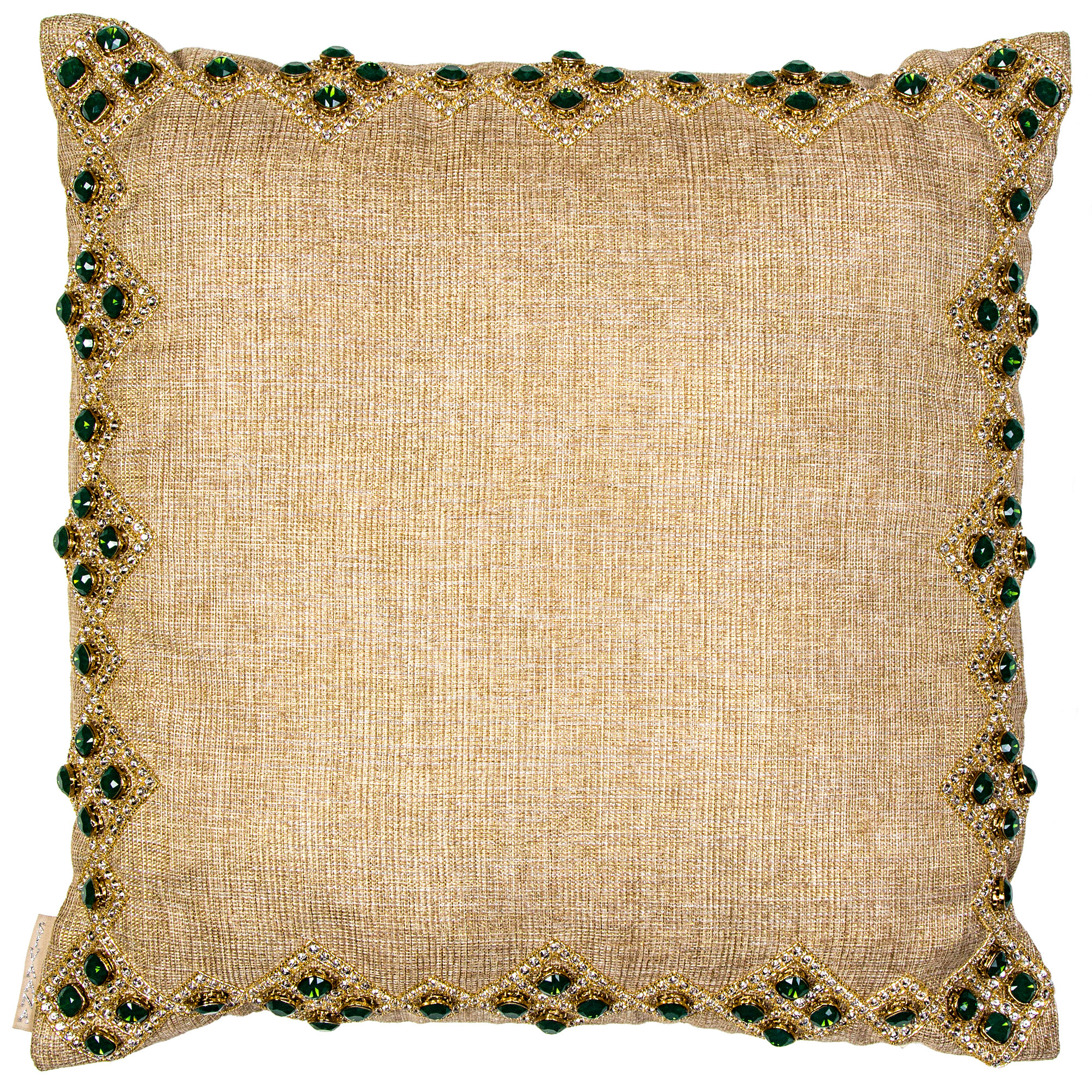 Emerald green stones hand embroidered as a border panel on a beige linen mesh textile.