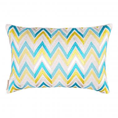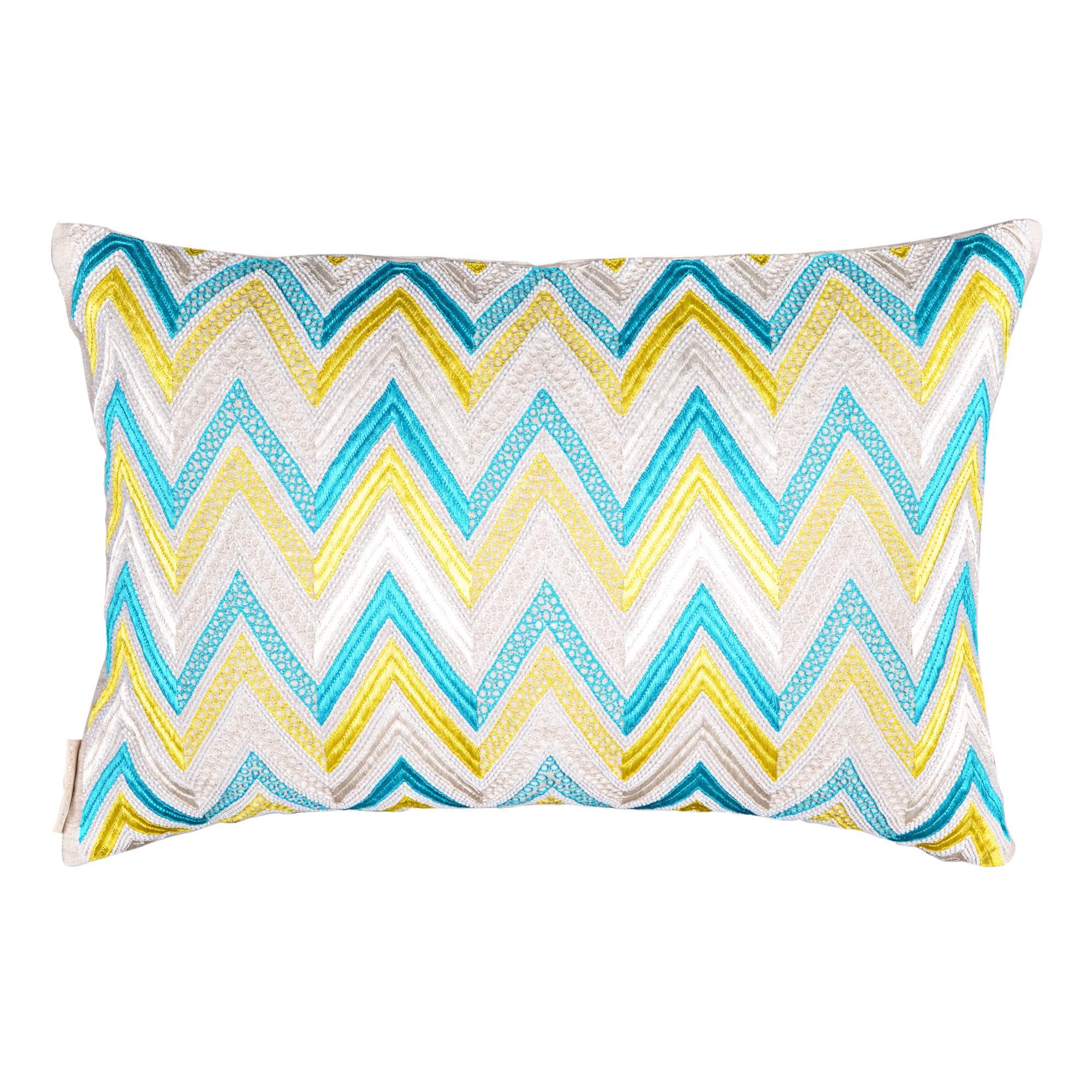 Zig Zag yellow and turquoise thread embroidery on a shimmer linen base