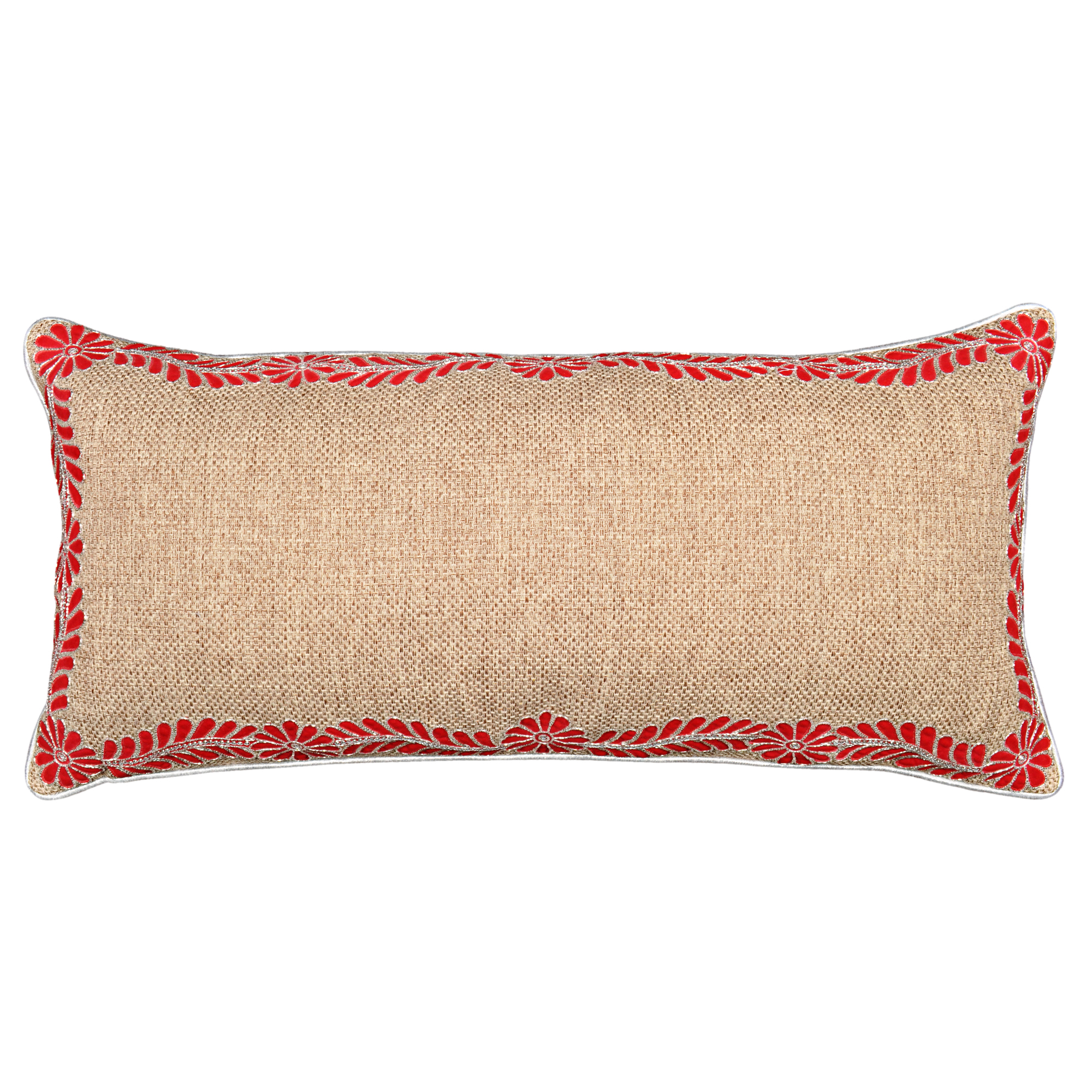 Red suede patchwork embraces a dahlia border on a coarse burlap. The result is stunning.