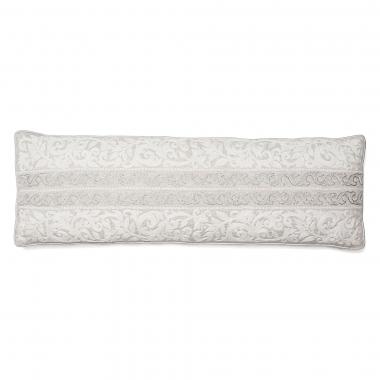 A silver base luxury linen textile highlited with a white thread embroidered center panel and crystals .